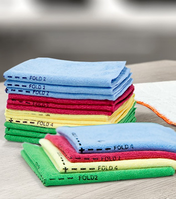 Color-coded microfiber cleaning cloths to trap and remove 99% of bacteria and dirt while preventing germ spread.